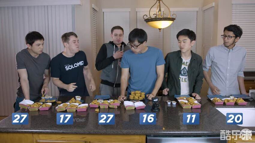 比赛规则也相当简单,每个参与者有50块炸鸡,时间为5分钟,最终吃得最多的人成为冠军,冠军可以获得500美金。参赛者包括TSM战队五名首发选手,还有他们的教练。虽然西方人喜欢吃炸鸡,但这次的比赛也完美诠释了,吃到撑死是怎样的概念,最终上单选手Hauntzer和中单选手Bjergsen以27块打成平手,进入加时赛。而下路组合亚裔二人组,显然在吃炸鸡比赛中胃口不支,论吃炸鸡还是西方人更胜一筹。