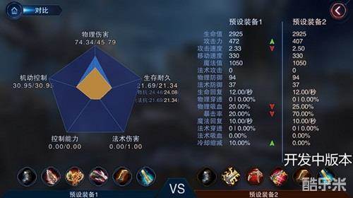 为了更直观的向玩家们展示装备的优劣搭配,预设功能还给出了不同装备的数据对比图,并将分为【物理伤害】、【生存耐久】、【法术伤害】、【控制能力】和【机动控制】五个维度,让玩家更方便的进行取舍。五维图的右侧是当前预设装备所带来的属性加成以及装备的唯一被动。