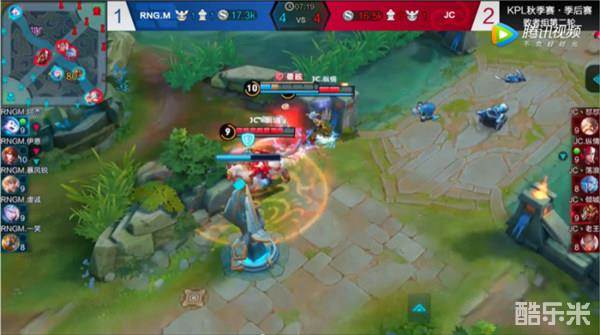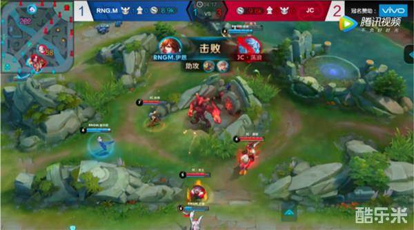 比赛进行了一分多钟,这时候的蓝色方的梦奇是第二次去野区骚扰,关羽看见队友已经赶往野区,于是直接用冲锋姿态下的一技能直接将梦奇和鬼谷子击退,达摩和诸葛亮便跟上进行输出,关羽则是往回退了一点,在原地绕圈使自己快速进入冲锋姿态,然后又将想要逃走的梦奇给推回去,梦奇因为在第一次反野的时候已经使用了闪现,没有了闪现的他最终被红色方击杀。