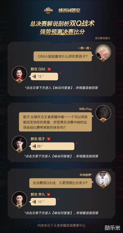 【峡谷问答室】第7期,KPL总决赛解说:GINI、瓶子、李九已经亲口回应了大家的提问哦~不管是赛事走势,还是生活八卦,在本期峡谷问答室中应有尽有。