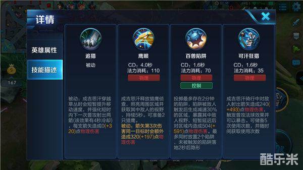 一技能——鹰眼:一技能是成吉思汗把控视野的重要基础,能保证成吉思汗前期发育的安全性,技能的被动效果,提高了成吉思汗的战场输出,不过要尽量的对同一目标进行攻击输出。