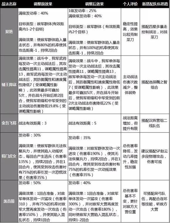 只有一个调整,战法有效距离由3提升为5。调整后吕布在我方大营位置技能可以混乱到对面的大营位置。
