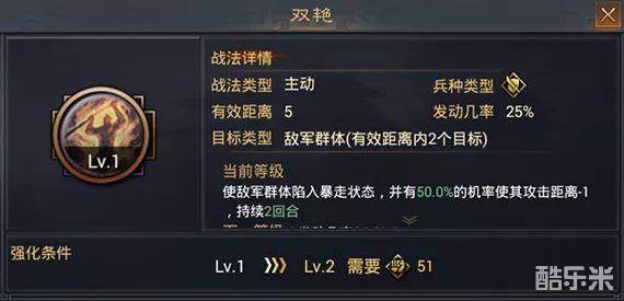 很多人都忽略了【双艳】的作用,暴走+攻击距离-1都是很不错的debuff效果,尤其对于菜刀型队伍,中军、大营位置不仅减少了攻击距离,还有暴走效果使其普通攻击会打队友,间接保护己方武将。