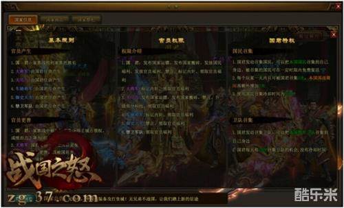 作为一款国战类游戏,国家是必不可少的部分,《战国之怒》的国家系统给了玩家一个归属感。同样,也会给玩家带来大量的福利。恒古不变的家族战争,最后的胜利者便能成为一国之君。万人之上的佼佼者拥有国家军政和文政的权利,军政下放至大将军以及车骑将军手中,文政则下放到大司马以及御史大夫手中,不同职位的官员享有不同的权利。谁若成为一国之君,便拥有国民召集以及卫队召集的特权,享尽万人敬仰爱戴之荣耀。