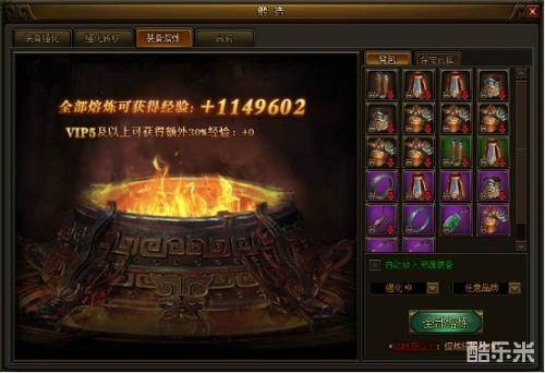 进入装备熔炼系统,我们可以把背包里的装备全部熔炼成经验,这里系统挺人性化的把背包的装备如果比身上装备的差那装备图案右下角会有个红色向上的箭头,一目了然再也不怕熔错装备了。可以看到装备熔炼能获得相当不错的经验,背包满的时候我们记得多熔装备哈。