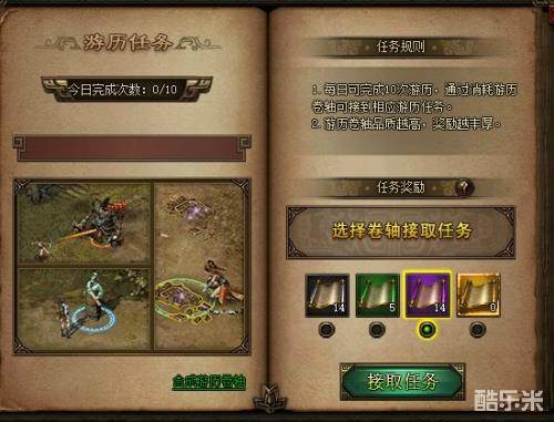 游历任务每天能完成10次,每次需要消耗一个游历卷轴来领取任务,游历卷轴分为白色、绿色、紫色、橙色四种品质,白色品质任务无奖励加成、绿色品质任务有额外的20%经验奖励加成、紫色品质任务有额外50%的经验奖励加成、橙色品质任务有100%额外经验奖励加成。选择消耗什么品质的游历卷轴即可领取什么品质的游历任务。另外游历卷轴可以低级卷轴合成高级卷轴,3个白色卷轴合成一个绿色游历卷轴;3个绿色卷轴可以合成一个紫色游历卷轴;3个紫色卷轴可以合成一个橙色游历卷轴。3个白色游历卷轴可以完成3个游历任务拿到300%的基础奖励,而合成一个绿色卷轴后只能获得120%的任务基础奖励;但是因为每天我们最多只能完成10个游历任务,决定了我们不可能无限地使用卷轴,如果卷轴特别多用不完的情况下我们可以将其合成高级的来用。而对于非RMB玩家来说游历卷轴的来源基本靠打怪掉落的白色卷轴,大家要根据自己库存来决定要不要合成高级的为用