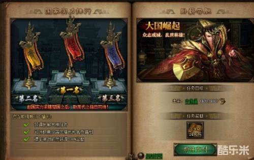 战国之怒国家实力排行是在开服后的第6小时产生,排行从开服第三天开始每日0点更新。若本国实力低于强国一定比例,将获得相应的国家福利——卧薪尝胆。