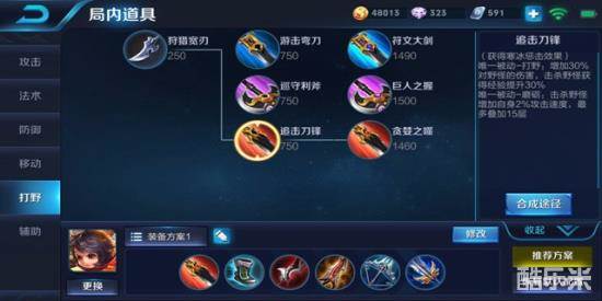 追击刀锋:元芳出到2级打野刀即可,能够增加刷野收益及攻速就好。