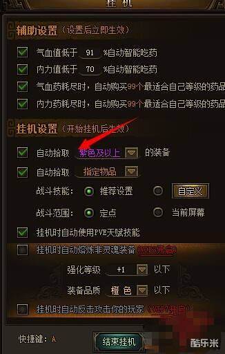然后是关于挂机设置的问题!打BOSS的时候一定要将拾取过滤重新选择。勾选紫色或以上就行,这样的话BOSS掉落的白装我们就不会去拾取,这样的话拿到好装备的概率比较高。