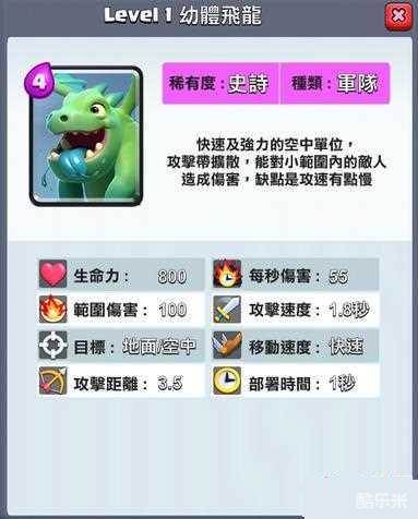 特别是对于亡灵大军这类卡牌更是有着不错的克制能力,飞龙宝宝虽然是一个远程输出的职业,但是射程相对较低的(3.5)并且攻击速度也是达到了1.6秒。