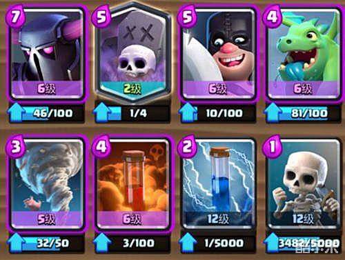 卡组思路:我们的卡组是一个标准的防守反击组合,同时还具有一定的坦克能力,在组合搭配中,进攻的思路主要为两个方面,一方面是在我们的卡牌防守后,如果防守卡牌的血量较多的话,那么搭配骷髅召唤来打出前后的夹击。