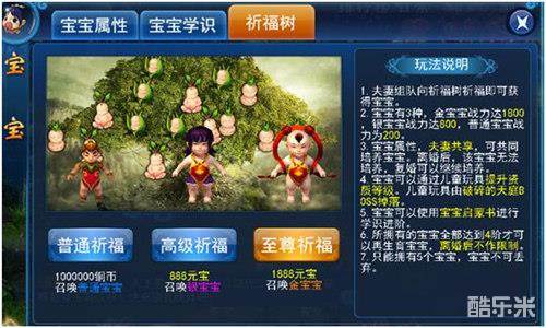 玩家在找到另一半,享受婚姻的甜蜜后,下一步当然是生儿育女,体验为人父母之乐了。《刀剑无双》此次测试将开通子女系统。玩家结婚后,并且达到一定等级(55),并且夫妻组队后,可以在宝宝页面中,购买祈福结,向祈福树祈福,获得宝宝。此后,玩家可以给宝宝取名、改名,也可以通过做任务提升宝宝资质和学识。享受养成的乐趣。
