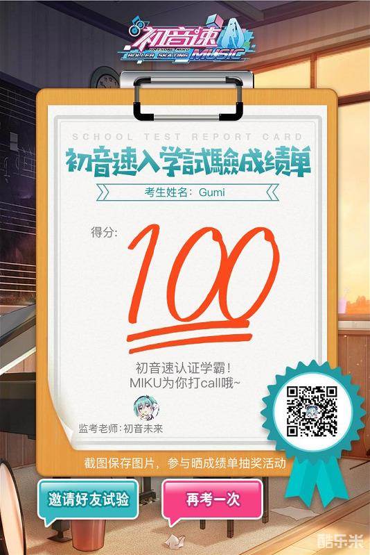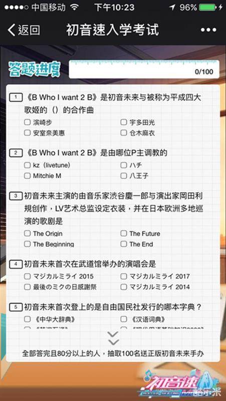 当然为了和更多的玩家分享到这份超级精彩的卷子,这份试卷已经被搬到了线上。玩家只需要关注《初音速》的微信,扫描二维码,或者登陆《初音速》官网首页,点击相关页面就可以进入答题界面,是时候彰显自己的学霸潜质了。已经有不少玩家进入了考场,甚至有主动要求增加试题难度的抖M呢!当然成绩优异的同学必须受到奖励,最终得分在80分以上的同学们,官方会随机抽取100位学霸送上初音未来正版手办一个哦!