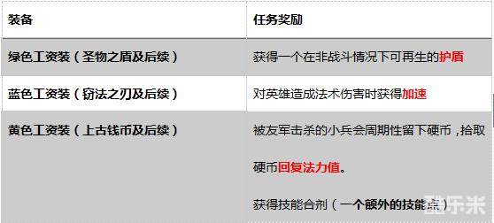 通过这张表格我们可以很明显看到,绿色和蓝色的工资装的任务奖励都是一种永久性,对全局都有增益的BUFF效果。尤其是绿色工资装,对于机器人,锤石这种TANK而言在本身高坦度的情况下这个盾更加难以打破非常烦人。