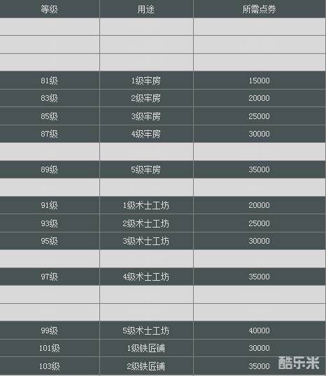 点券是游戏中除了金币之外的第二种万能资源,不但可以换粮食,铁,影子,就是装备,牢房,商会等等一些基础设施都需要它,对于它的需求量也很大,很多小号经常喊的一句话就是没点券。不计算换粮食,镔铁,影子等点券在内,我们最基本的点券需求量分别为: