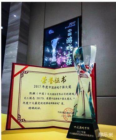 《三国志2017》荣获“2017年度十大最受欢迎移动网络游戏”