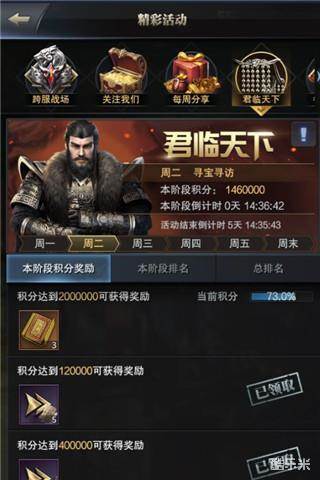 周二活动为内政建设,在此活动阶段内寻访武将寻获宝物,按照武将宝物的品阶计算积分,聚贤府跟潜龙阁寻访得到的武将都算积分,其他如碎片换取的武将,不算积分;周三对应活动为资源采集,这是一个拉仇恨的活动,活动内容是按照主公们采集或者抢掠其他玩家的矿产数量计算积分。每1万铁矿起开始计分,不满1万不算积分。只计算采集跟掠夺的,不计算玩家沦陷其他玩家主城获取的资源。自从后期玩家都开始喜欢炸矿之后,大部分玩家都不采用步兵去挖矿,而且采用弓兵,建议各位主公炸矿之前记得先侦察一番,以免翻车!周四,第四阶段众志成城,需要玩家们连同盟友击杀南蛮,按照南蛮等级和对应等级的杀敌排名获得积分,参与此活动的个人积分将会在邮件中显示。