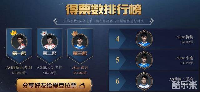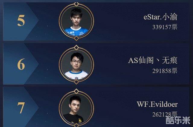 根据活动规则,同个俱乐部最多两人入选,否则按排名顺延下一位选择其他战队队员顶替。所以,第五名eStar.小渝将无缘明星赛,参赛选手替换为第七名WF.Evildoer。