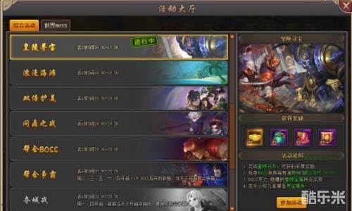如果时间能充分到可以在指定时间上线,那么就可以按照活动大厅去参加一些综合活动和打野外BOSS,这个奖励是最丰厚的,也是有难度和危险性的,建议新手不要太关键,等级高一些,战斗力强一些再去。