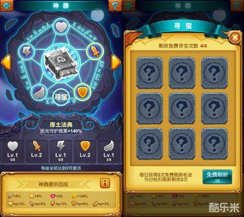 当然勇者们自身必须拥有一定实力才能获得神器的认可,所以只有大家闯关达到500关后才可以开启神器功能,届时大家可以进入体验全新的神器玩法,大家可以通过寻宝来获得相应的“灵媒”来激活神器!而“灵媒”也分为5种“剑、心、盾、雷、羽”同时拥有5种灵媒后,即可激活神器!