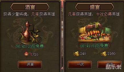 酒馆,在大皇帝游戏喝酒是一种交际的重要手段我们的大部分将领都是靠喝酒喝来的,而且这样的关系还非常的牢靠,酒馆中和喝酒方式一共有两种,第一种叫做酒宴,我们可以使用酒坛就行宴请,在这个过程当中我们可以获得少量的将魂,同时有一定的几率获得新的英雄,但是这个玩法需要我们在游戏不断的获取烈酒,烈酒在游戏中获取的途径其实还是很多的,我们最好不断的积攒,然后在积攒的100个左右的时候统一使用,这样的效果是比较好的。