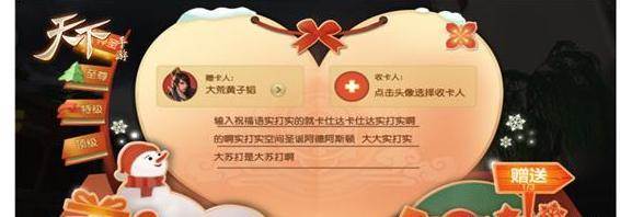 过圣诞节,你想用特别的方式来对朋友传达你的祝福吗?把你的心意、你的祝福、你的表白、你的礼物都放到《天下》手游圣诞贺卡中。贺卡发送,天下同庆,不仅收贺卡的人能感受到你的祝福和表白,所有大荒子民都会在你贺卡中获得随机礼物,特级和顶级还有概率触发鸿福,真是一张贺卡祝福天下人。
