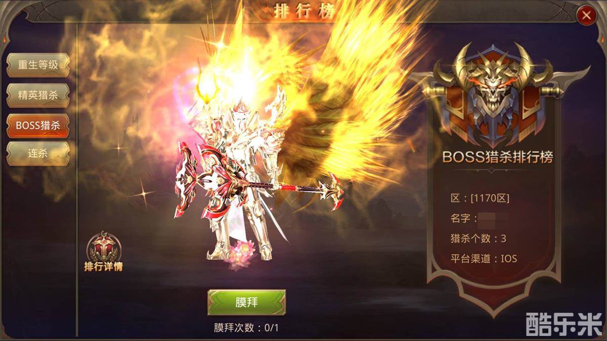 击杀BOSS虽有难度,但这也是一件名利双收的事,猎杀重生BOSS后不但可以得到丰厚的奖励,还有可能登上猎杀BOSS排行榜,这个排行榜猎杀是指玩家昨日猎杀重生BOSS个数的排行榜,猎杀BOSS排行榜上第一名的玩家还能受到其他玩家的瞻仰膜拜。这里要提醒各位,在击杀BOSS后要及时领取奖励,否则BOSS再次刷新的时候未领取的奖励将会被清空。