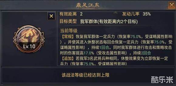 追加效果——若我军三名武将兵种相同,休整效果变为立即恢复一定兵力。