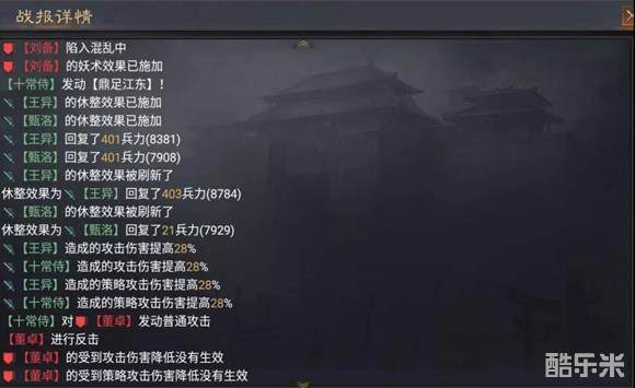 常规效果——发动后恢复我军群体一定的兵力,这个数值是与谋略属性挂钩的。并在一回合内进入休整状态恢复一定的兵力,这里也是与谋略属性挂钩。