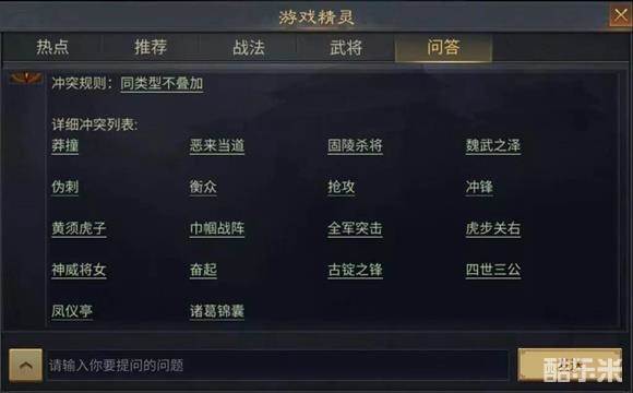 值得一提的是,【鼎足江东】作为主动战法,和一些增加伤害的技能存在一定的冲突,所以在配置队伍时候要注意。以下是一些与【鼎足江东】相冲突的常见的战法。