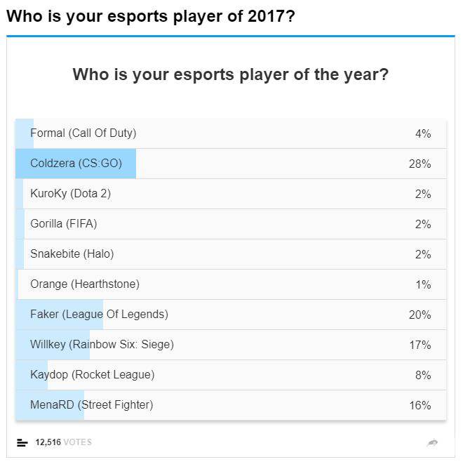 去年,Faker也曾获得该奖项提名,他最终得到了19000票排在第三,落后于CSGO选手S1mple的40000票以及火箭联盟选手Kuxir97的26000票。