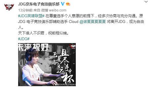 在尊重选手个人意愿的前提下,经多次协商与充分沟通。原 JDG 电子竞技俱乐部辅助选手 Cloud@诺夏夏夏夏夏将离开JDG,成为自由人。