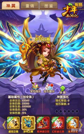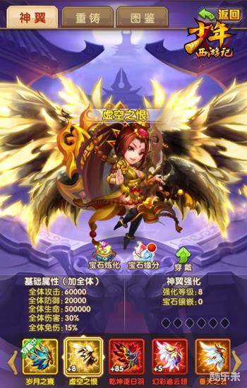 作为最强的攻击型金色神翼,玩家佩戴“虚空之恨”后,可为全体神将提供大量的伤害加成,增强阵容的输出能力。同时,玩家通过镶嵌宝石和激活宝石缘分,还可进一步提升属性,在对战时将更加强势。