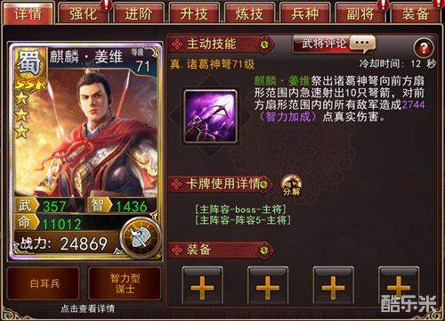 麒麟姜维作为蜀国后期顶梁柱,他在游戏身为一名SSR品级智力型步兵武将,超高的智力成长使他成为战场上的重要输出。技能诸葛神弩更是整个游戏中少有的高爆发技能,该技能可以对前方扇形范围内极速射出10只弩箭,对敌人造成高额真实伤害。对滴,就是真实伤害,敌人的一切防御能力在该技能面前形如虚设。