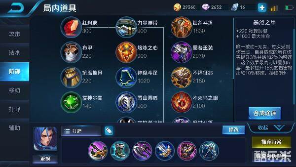 此套出装只要一件防具,完全追求高爆发高伤害,可以使橘右京一套技能秒杀敌方脆皮英雄,巡守利斧提升橘右京打野速度,因为橘右京靠技能输出不需要太多攻速,出巡守利斧反而可以补充一下生命值,提升容错率,鞋子看敌方阵容选择抵抗之靴或是影忍之足,暗影战斧作为橘右京核心装备之一具有高额破甲效果,并且冷却缩减对于橘右京来说是必不可少的,破军不仅增加物理攻击也提高了橘右京对敌方残血的收割能力,暴烈之甲性价比超高提升橘右京生存能力的同时增加一定输出,如果敌方射手强势就换反伤刺甲,如果敌方法师强势就换魔女斗篷,最后一件破甲弓则使橘右京面对半肉战士也有一战之力,双破甲无论是脆皮英雄还是半肉战士,打起来都是得心应手,大后期还可把巡守利斧卖掉换贤者的庇护。