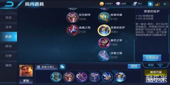 最后一件推荐贤者的庇护来强化苏烈的被动复活效果,在中后期复活甲对苏烈的收益极高,能让他连续死两次(自身被动一次,复活甲一次)而且半肉苏烈比较能扛,即使在团战中没能打出高额输出也能吸收大量伤害。