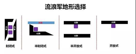 流浪军会依赖地形来保证生存和进行劫掠,那么,一般的地形可以分为封闭、半封闭、半开放和开放式四种。这四种地形各有优势和缺点。比如封闭式最安全,但周边分城少,铺路难;而开放式劫掠最容易,但也容易被围剿。所以,流浪军为了避免这样的问题,会扬长避短,将各种地形综合起来利用。