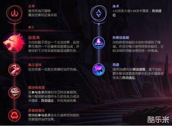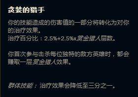 贪婪的猎手:通过参与击杀可以是的技能造成伤害能提供治疗效果,毕竟大招全屏混助攻,因此可以很快叠满,搭配血之滋味效果更佳。