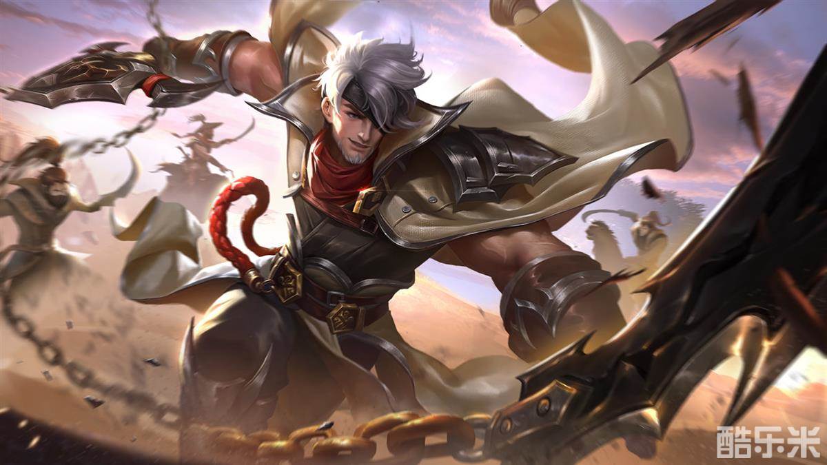 在背景故事中,夏侯惇是一位令盗匪闻风丧胆的大漠佣兵,但是现在游戏里身披一件外套的装扮,和大都督周瑜会有一些重复,我们并不想让玩家把夏侯惇和周瑜联系在一起。其次,赤裸上身对于一位身处大漠之中的英雄也并不合适,所以我们给他穿上了符合环境的服装:伪装色的披风以及防风沙的围巾,并且对武器的款式进行了调整,更符合佣兵的身份。