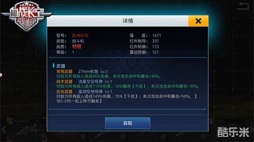 歼-20的武器常规武器或战术武器特殊效果是增加敌人所受伤害,5%几率造成干扰,减低对方命中率。反过来就是增加自己的闪避率,提高生存力。