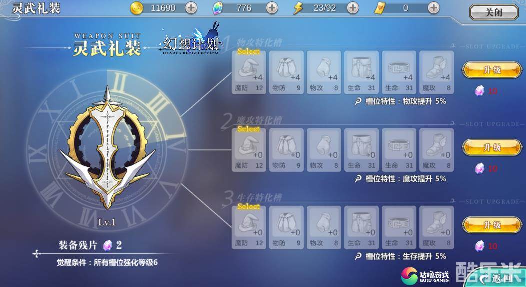 装备碎片可以用来强化灵武礼装,与职业槽位相同。灵武礼装也具有三种加成,分别是“物理加成”、“魔法加成”、“生存加成”,灵武礼装的等级是具有上限的,根据人物等级的提升也会提升相应的等级上限。