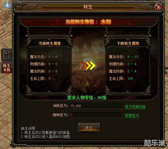 玩家90级可开启转生系统,通过点击角色按钮可进入转生界面: