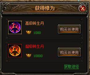 转生等级提升需要消耗转生修为,可以通过活动、礼包、商城等得到的转生丹来获取修为