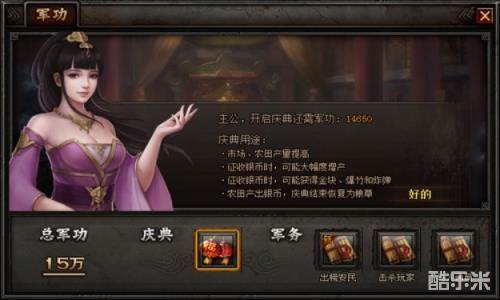 游戏中通过打城战、国家政务事件等可以获得军功,收集到一定军功后可以开启“庆典”,而 “庆典”可以给大家带来大量的银币。