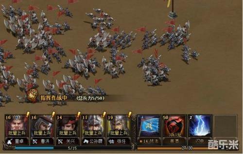 进入战斗后,界面下方可进行上阵部队、释放战法、喝美酒、释放闪电和释放特殊战法操作.