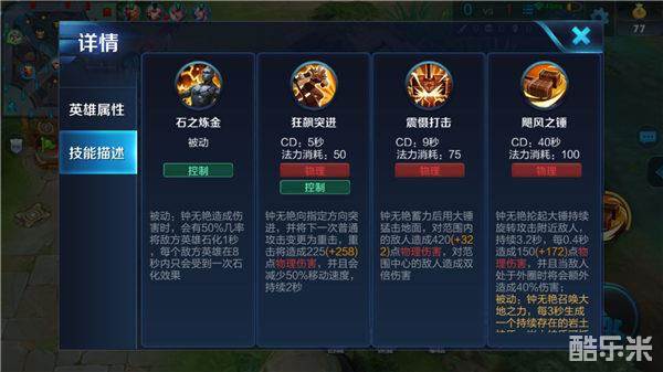大招——飓风之锤:大招是钟无艳持续性AOE输出技能,也是钟无艳触发被动石化的最佳手段。大招的被动,能让钟无艳承受更多的伤害,提高其战场存活能力。