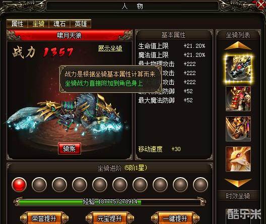 每当出去练级挂机或者打boss的时候,别人第一眼看的不是你的战力,也不是你的装备强弱,而是你的坐骑,而一款高等级的拉风坐骑务必会吸引众人的眼光。而坐骑的高等级除了华丽的外观外,也直接影响到人物的战力高低。因为坐骑会拥有一项基本属性,而这些是直接夹在人物属性上的,这样的话可是非常可观话的说。
