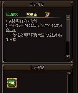 除此之外,很多副本都是可以说是上上之选,比如转生神殿,目前70级的人虽然说不是很多,可是都已经有不少的人开始为转生而去做准备了,转生神殿的出现无疑就是为了这个,70级的转生便是需要1000的转生灵魂,每天都会有一次进入转生神殿的机会,当然,副本通行证是可以增加次数的。