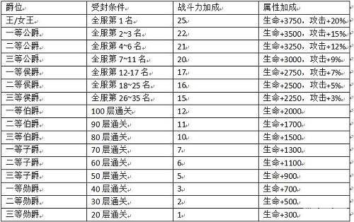 爵位从低到高为玩家提供的战力加成也会随之增高,此外,爵位的提升还能够为玩家提供生命的加成,与战力相同,生命加成也会随着爵位的提升而得到相应的提升。当玩家被册封为侯爵之后,还可获得攻击加成。三等勋爵可获得一点战力加成及300生命加成,被册封为王的玩家最高可获得25点战力加成,生命值增加3750,同时获得20%的攻击加成。