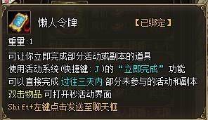 首先大R可以无视懒人令牌的存在,因为里面任何的操作都可以用元宝去代替实现的,懒人令牌顾名思义,懒人专用,可以让你立即完成部分活动和副本,而且时间是三天哦!甚至连挂机都能直接使用懒人令牌!